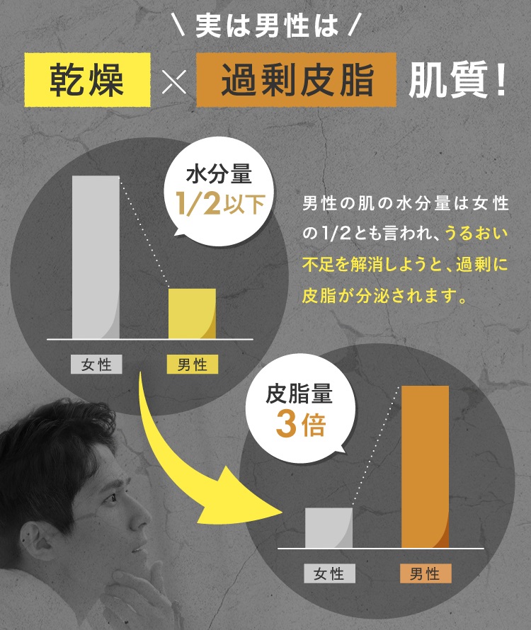 男性の肌は女性に比べて水分量が2分の1以下しかないにもかかわらず皮脂の分泌量は約3倍にもなることが分かっています。