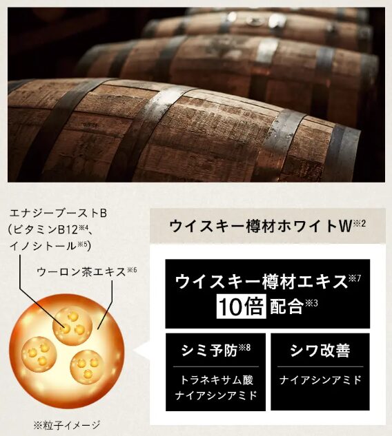 ※1 ナイアシンアミドとトラネキサム酸を有効成分として、ウイスキー樽材エキスと配合している医薬部外品は日本初(2025年2月実施|ミンテル社によるデータを基にした自社調べ) ※2 オークエキス、1,3-ブチレングリコール(保湿) ※3 サントリー従来比 ※4 シアノコバラミン、1,3-ブチレングリコール(保湿) ※5 イソリット、1,3-ブチレングリコール(保湿) ※6 ウーロン茶エキス、1,3-ブチレングリコール(保湿) ※7 オークエキス、1,3ーブチレングリコール(保湿) ※8 メラニンの生成を抑え、シミそばかすを防ぐこと